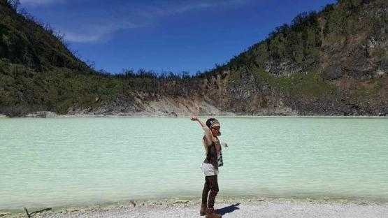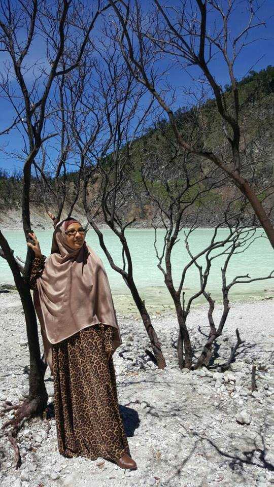 Aku tiba di halaman parkir yang luas dan tertata rapi. Hhhmmm … Bau menyengat menyeruak menyambut kedatanganku. Teteh sempat menutup kembali pintu mobil karena tidak tahan baunya. Dia juga reflek menutup hidung dengan ujung jilbabnya. “Bau apa nih Bu?” Aku jelaskan bahwa tempat yang akan dikunjungi di balik pepohonan berbentuk unik itu adalah Kawah Putih. Danau yang terbentuk ribuan tahun yang lalu. Ya! Sungguh putih kehijauan dan menebar suasana eksotik-mistik.