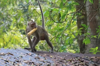 Beberapa kali kamera Canon Teteh menangkap aksi kocak monyet Tahura. Ada yang mengintip malu dari balik rimbun semak. Ada yang bergelayutan dari satu ranting ke ranting pohon lainnya. Nah … Ada juga monyet yang iseng memungut sisa jagung bakar dan dibawa ke atap warung. Iiiihhhh … Aya-aya wae.
