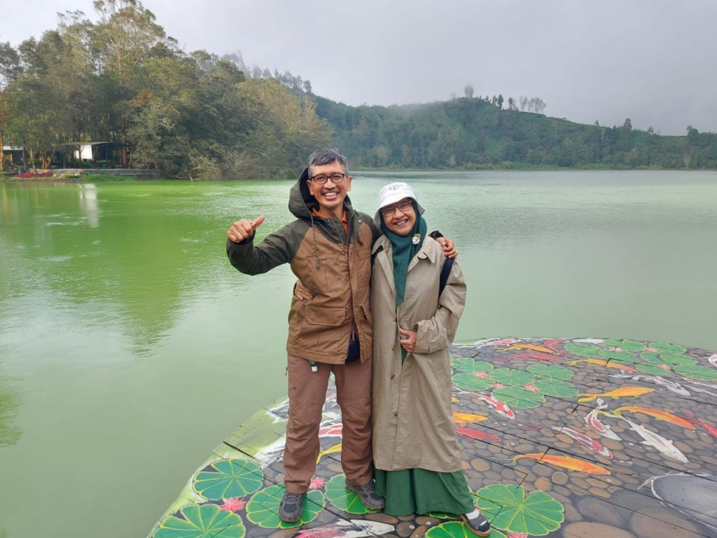 Teteh sebelumnya pernah juga ke Dieng di masa pandemi, jadi tidak bisa masuk ke Telaga Warna. Nah … Kali ini lokasi rekreasi alam berupa telaga ini telah dibuka kembali untuk umum. Mengapa diberi nama Telaga Warna? Ooohhh … Ternyata tempat ini mempunyai keunikan fenomena alam yang terjadi di tempat ini, yaitu warna air dari telaga tersebut yang kerap berubah-ubah. Lihatlah latar fotoku di atas, warna airnya hijau terang. Kebetulan aku juga sedang memakai kostum berwarna hijau he3 … Kok kompakan gitu ya sama telaganya? He3 … Oya … Kadang telaga ini memunculkan warna biru dan kuning atau bisa juga warna warni seperti pelangi. Fenomena ini terjadi karena air telaga mengandung sulfur yang cukup tinggi, sehingga saat sinar Matahari mengenainya, maka warna air telaga tampak berwarna warni