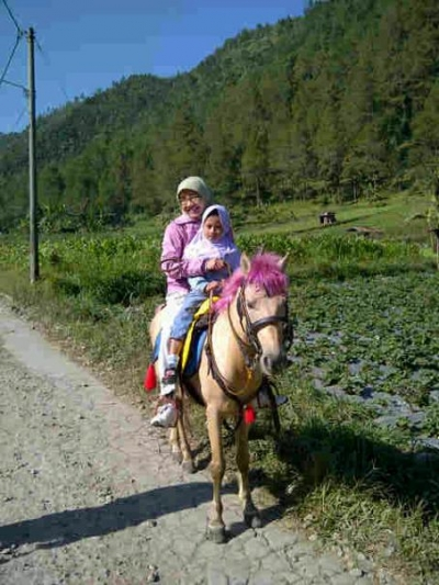 Pengalamanku ketika di Tawangmangu menginap di sebuah cottage dengan latar bukit pinus yang hijau. Udara di Tawangmangu begitu sejuk segar. Pagi hari embun menyelimuti dan membasahi rerumputan. Saat matahari beranjak naik, aku dan Teteh berkuda di jalan pedesaan Tawangmangu. Aih … Terasa sensasi super happy… Layaknya putri kerajaan, Teteh asyik berkeliling perkebunan sayur dan strawberry hingga ke area bumi perkemahan. Kuda putih yang lucu … Jambulnya diberi warna merah jambu he3 … Jadi deh serasi dengan jaket kami berdua. Tak lupa aku berbelanja buah pisang dan jajanan tradisional di pasar Tawangmangu. Menarik sekali loh belanja di sini. Hampir 90% pedagangnya adalah perempuan. Hebatnya lagi 90% perempuan itu adalah separuh baya malah ada yang sudah lansia.
