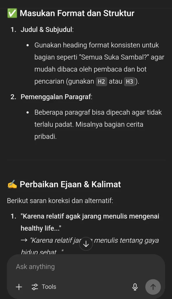 Ketika kita ragu apakah tulisan kita sudah cukup benar format penulisannya dan penataannya, kita juga bisa menanyakan AI sebagai solusinya. Namun mungkin dalam cek ejaan dan penulisan nggak begitu berlaku untuk blog yang memakai bahasa sehari-hari atau non-formal.