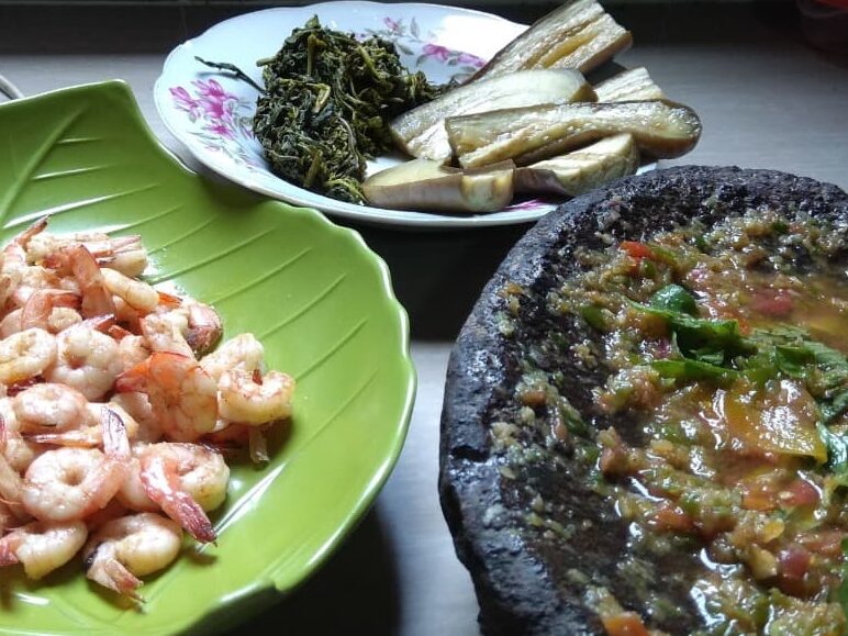 Udang goreng, rebusan sayur, dan sambal kencur