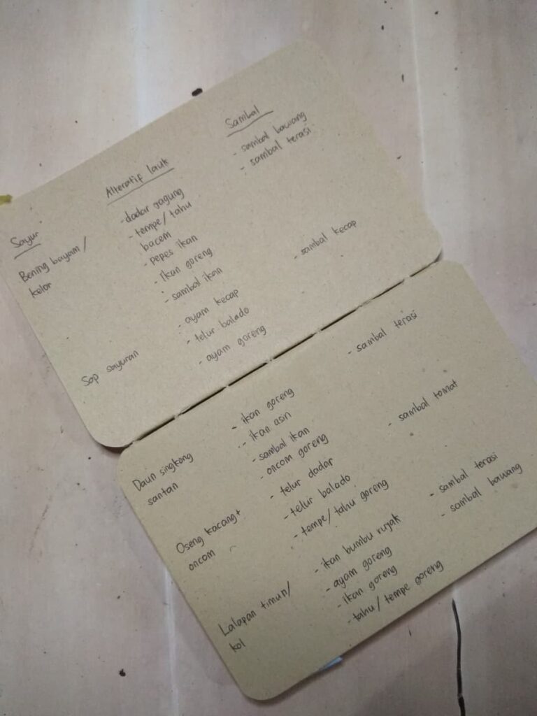 Setelah mendapat beberapa alternatif masakan yang memang cocok dengan selera keluarga, saya lanjut menuliskan alternatif-alternatif lauk yang cocok untuk tiap menu sayur tadi, berupa lauk yang mengandung protein hewani dan protein nabati, dalam wujud digoreng, dikukus, disambal, dan dipanggang.