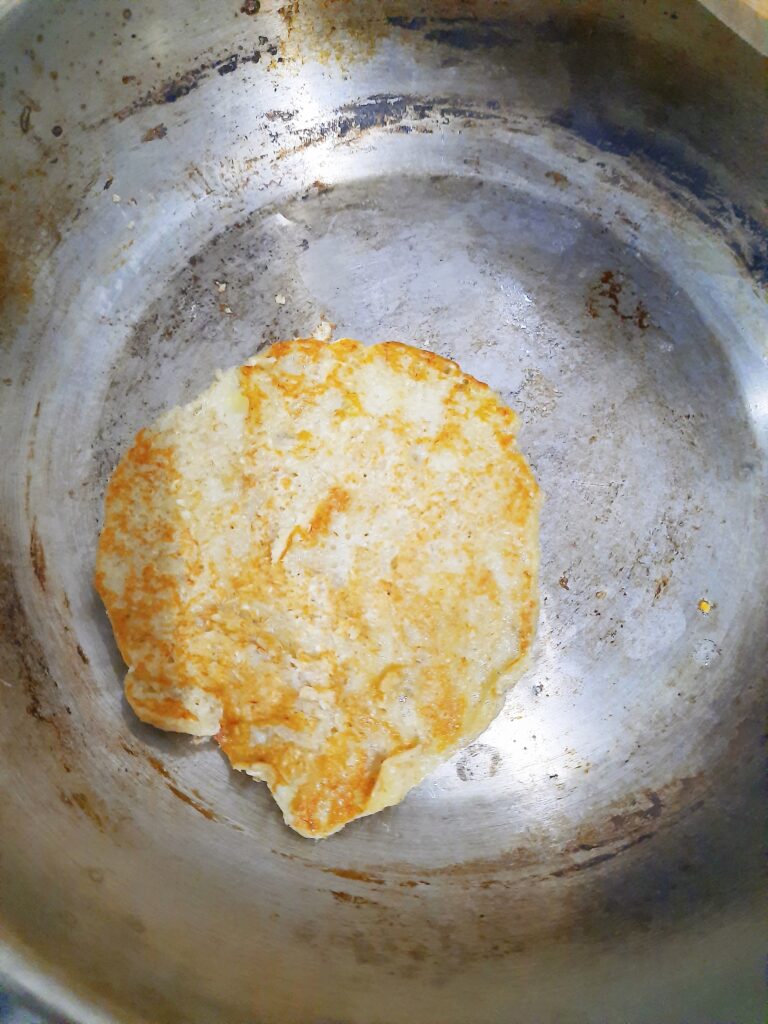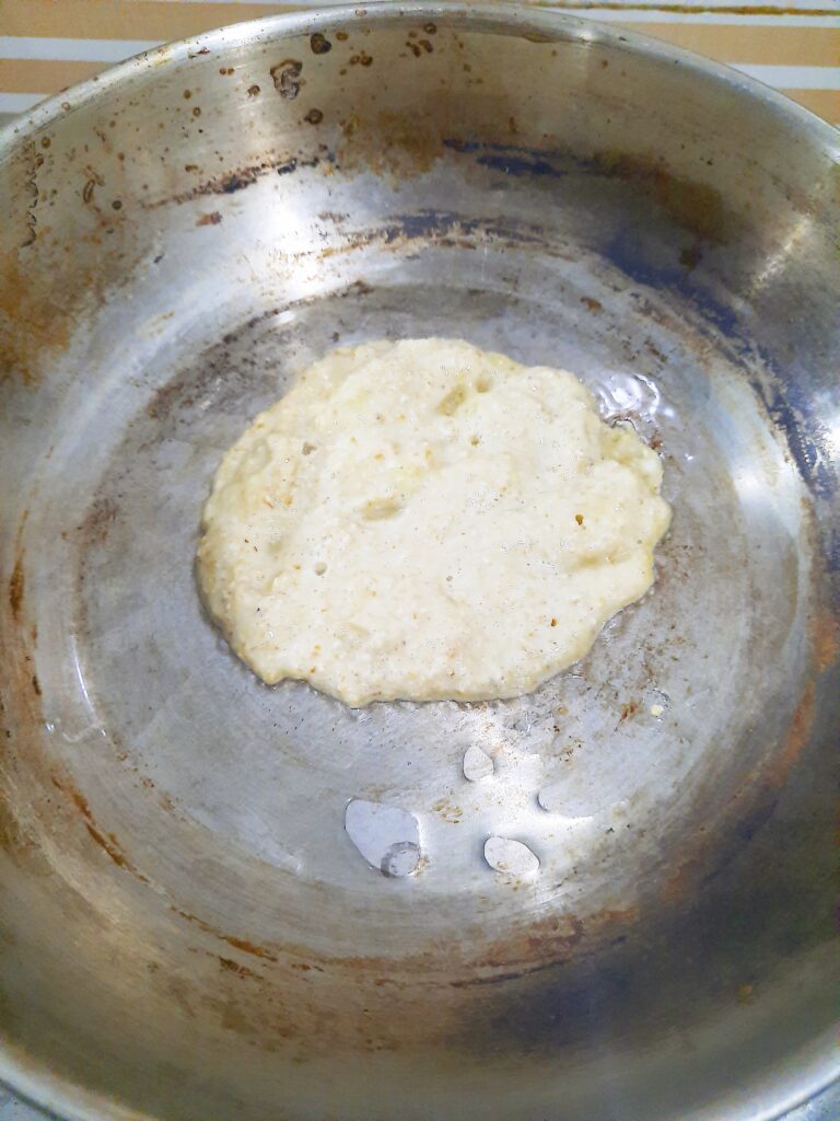 3. Panaskan pan dengan api sedang, olesi minyak sekitar 1 sdt. Masak adonan dengan takaran 1 sendok sup besar atau sesuai selera. Kecilkan api, tutup.
