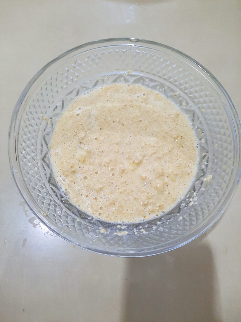 - Blender kering Rolled Oat. Kocok telur.