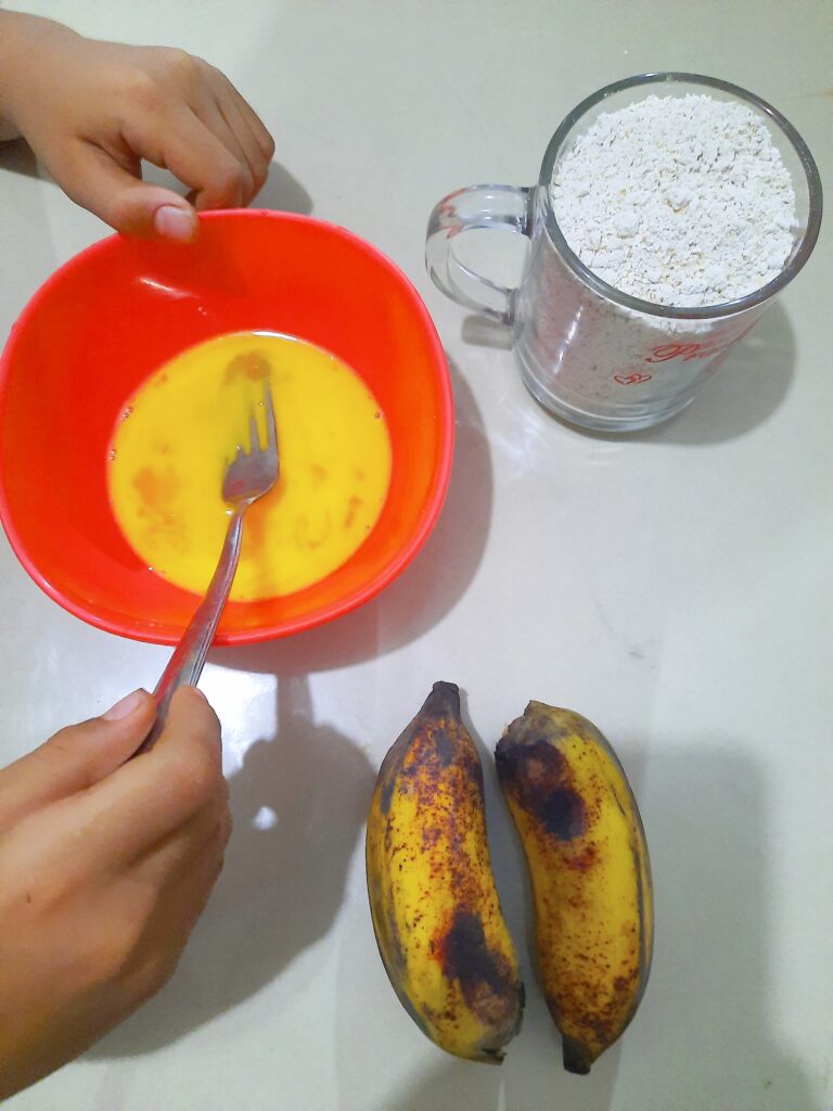 2. Lumat pisang lalu campur semua adonan, tambahkan air, bubuk kayu manis, dan garam.