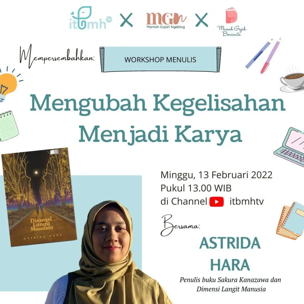 Workshop Menulis ITBMHTV x MGN x MAGATA bersama Astrida Hara : Penulis Buku Astrida Hara berbagi ilmu di Workshop “Mengubah Kegelisahan Menjadi Karya” di channel ITBMH TV Official yang dimana peserta workshop adalah member Mamah Gajah Ngeblog dan Mamah Gajah Bercerita (MaGaTa). Tonton videonya disini.